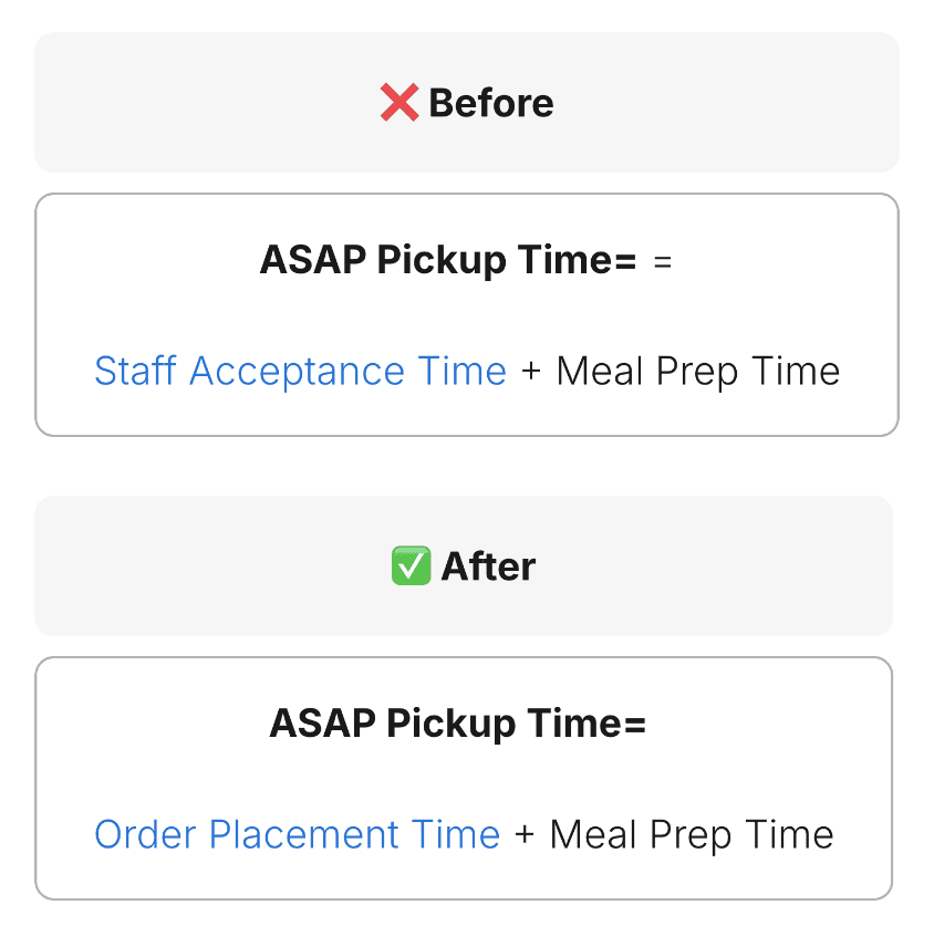 I chose to calculate ASAP pickup time at order placement instead of staff acceptance, ensuring ASAP always appears earlier than scheduled options and matches customer expectations. While this can tighten preparation time, 93% of restaurants accept orders within one minute, and research showed restaurants prefer this risk over losing orders, with the flexibility to reject or adjust orders when needed.
