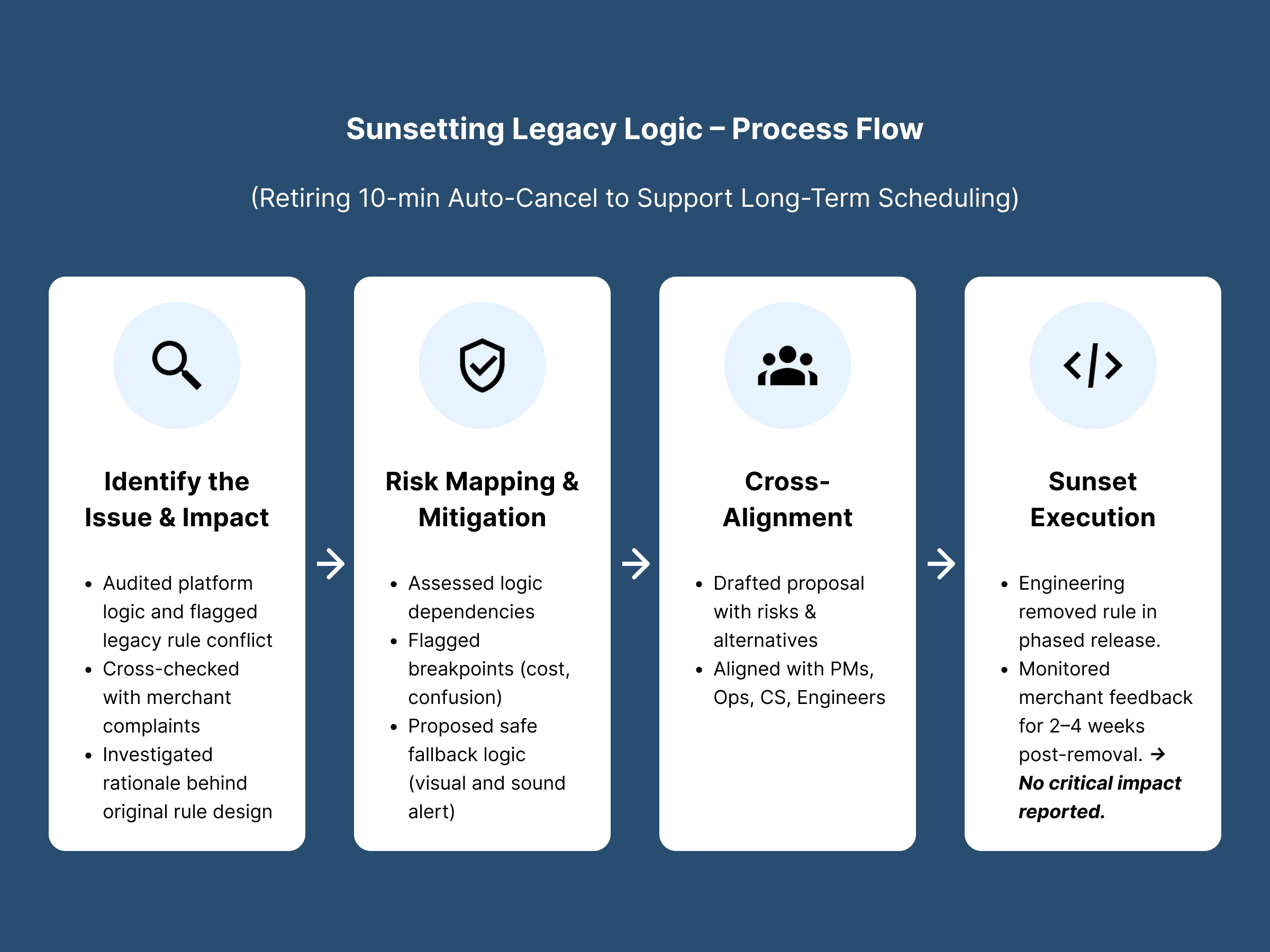 Through system-level analysis and cross-functional reviews with PM, Engineering, and Ops, I led the decision to sunset this rule. Removing the constraint reduced operational friction and allowed scheduled orders to function reliably in real-world restaurant workflows.
