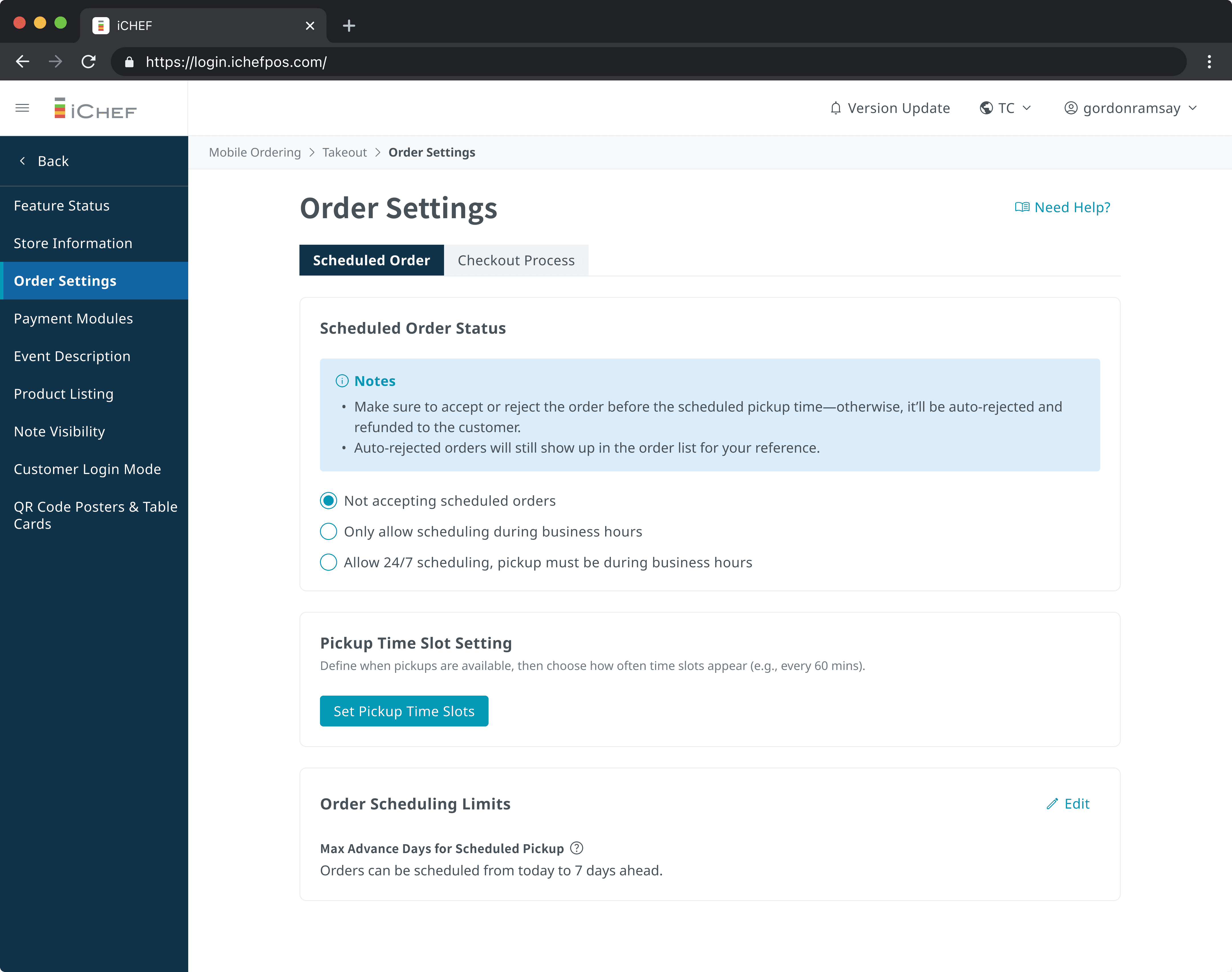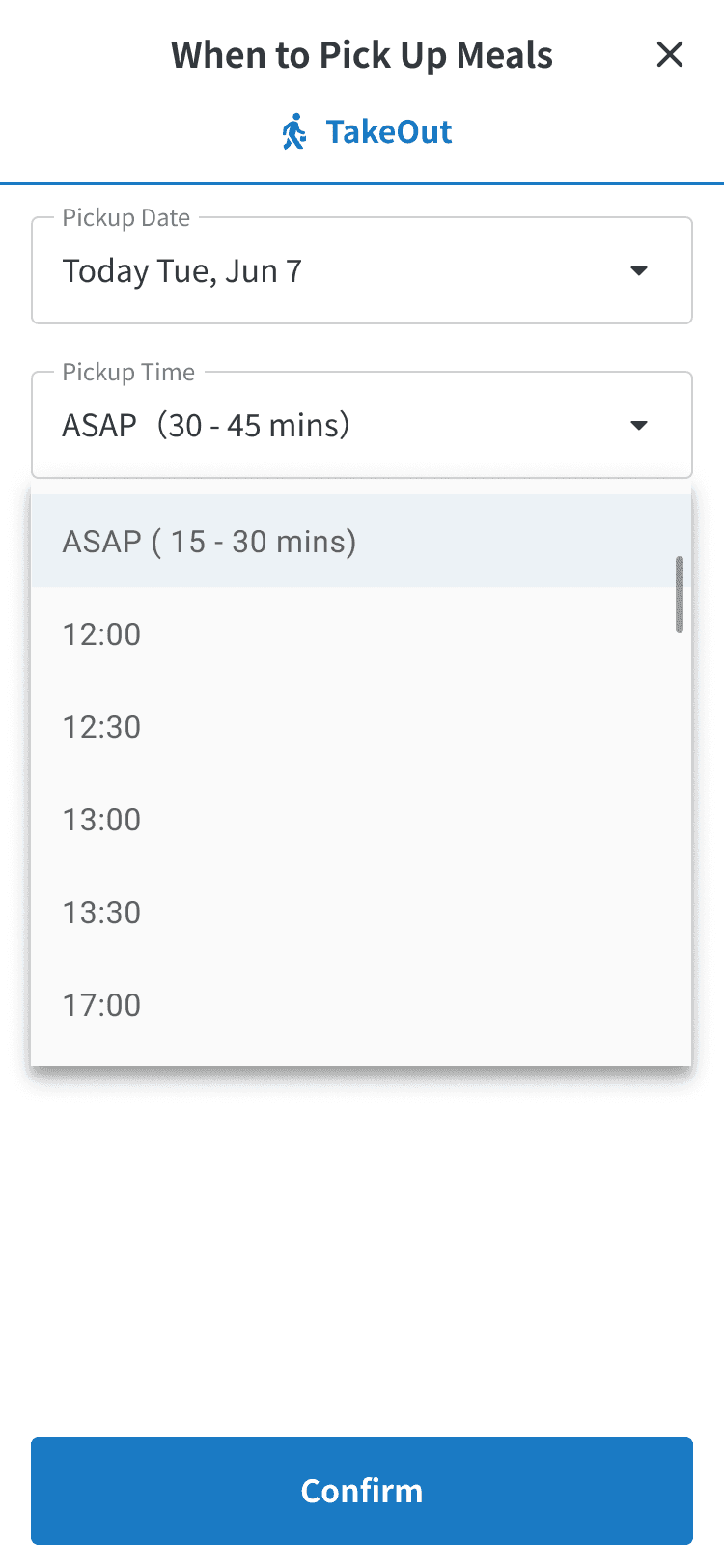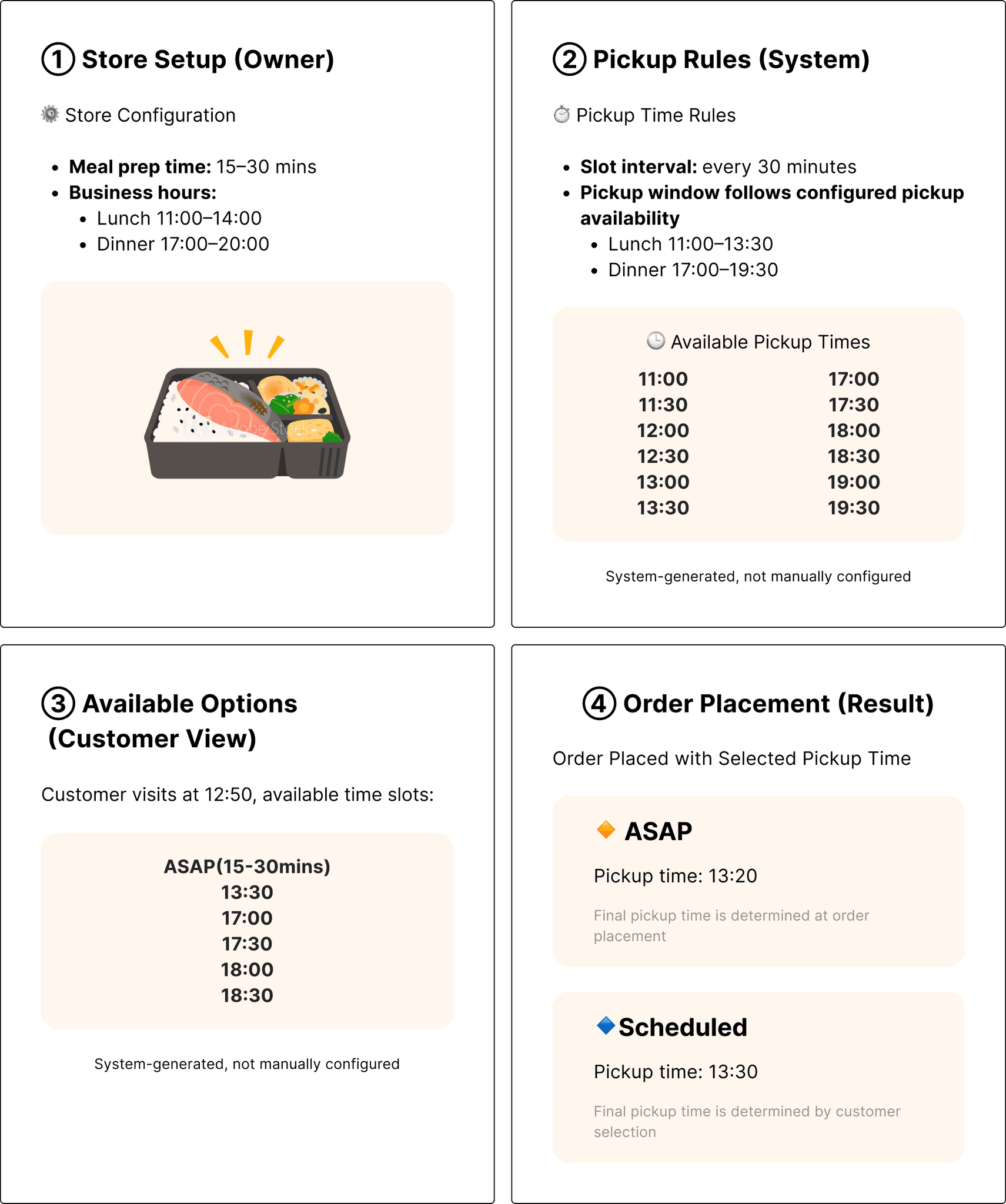 At the same time, pickup options are generated from each restaurant’s configured pickup windows, so customers only see times the restaurant can realistically fulfill.